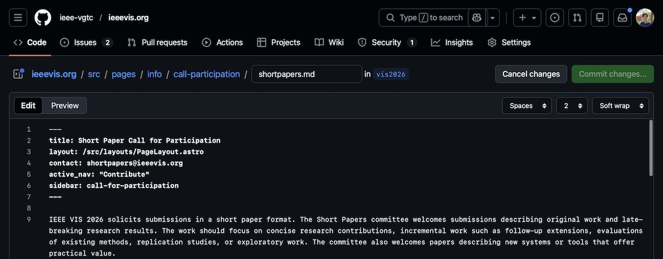 If you are an organization member, the best way to suggest a change is to go on the bottom of the page you want to change and click on “suggest a fix”. You can even go to a webpage that hasn’t been created yet (like http://ieeevis.org/year/2026/hellothere) and click on the link for making a new page. You will be taken to GitHub to make your edits.